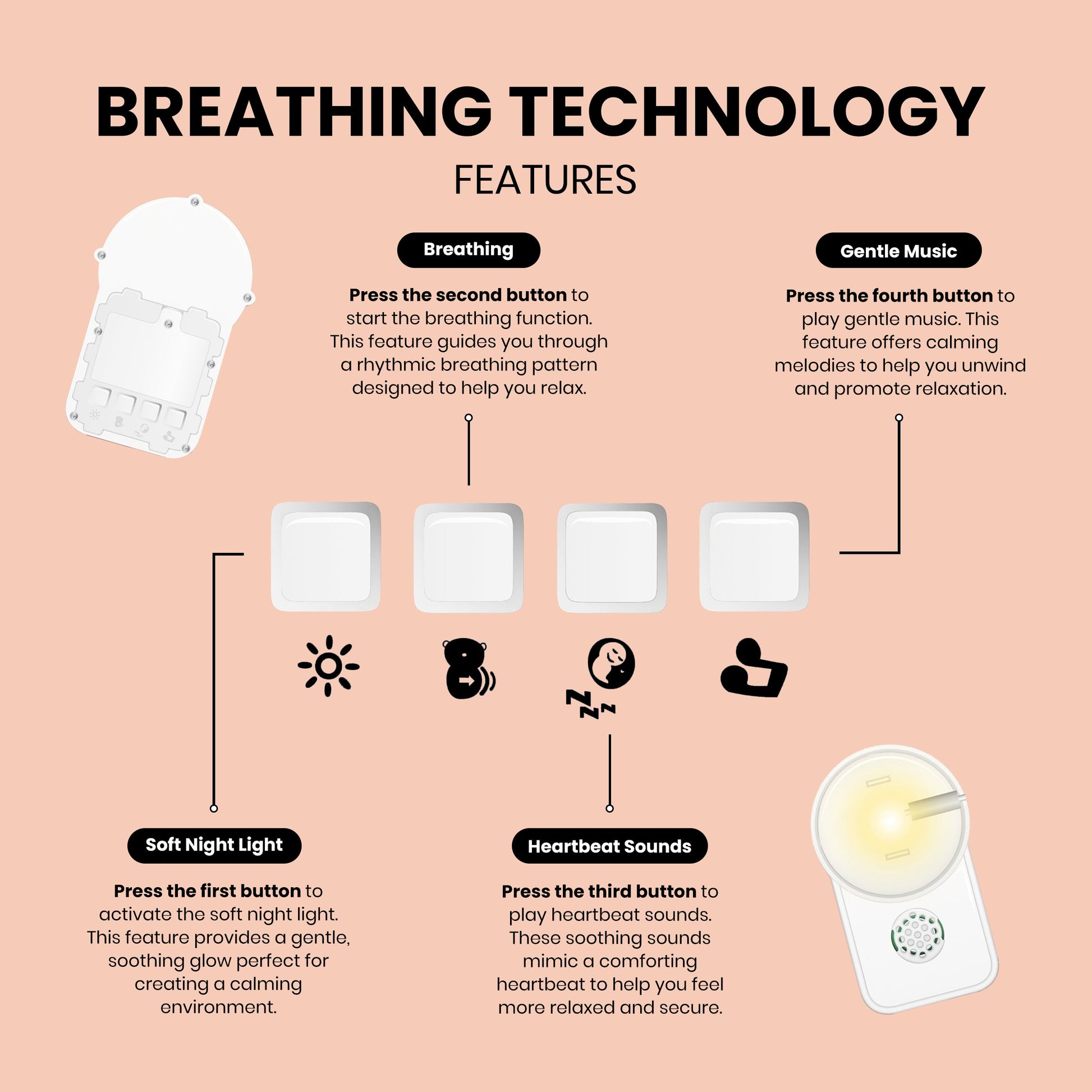 Each feature is designed for serenity — from the soft night light that creates a tranquil glow to the breathing and heartbeat modes that naturally slow your rhythm.